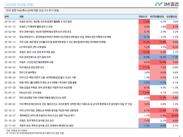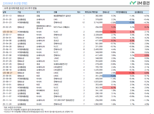 iM증권 변용진 애널리스트는 "사이클은 끝나지 않았다 '2026년 조선'" 리포트를 통해 어닝 서프라이즈 시에는 美 특수선 이슈만큼의 상승은 아니지만 주가가 긍정적으로 반응했다고 밝혔다. 한화오션 4Q24 +10.1% 등 서프라이즈 구간에서 의미 있는 주가 상승을 확인했다는 것이다.