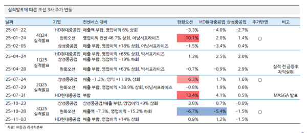 반면 실적이 컨센서스를 하회할 경우 주가 또한 크게 하락했다고 언급했다. 한화오션 3Q25 영업이익이 컨센 15.2% 하회 --> 한화오션 주가 6.7%, HD 현대중공업 5.4%.