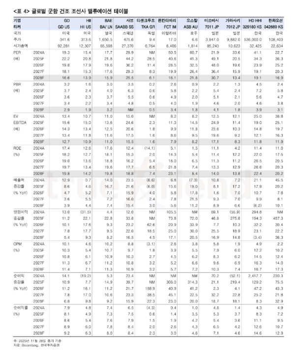 2026년은 영업이익 고속 성장을 약속할 수 있는 마지막 해라는 진단이다. 조선 4사 합산(HD현대미포는 HD현대중공업 합병법인으로 계산) 2026년 연결 매출액은 57.3조원(+18.2% YoY), 영업이익은 8.7조원(+51.5% YoY, OPM +15.3%)으로 추정한다. 경영 목표 수립 시 기준 환율은 1320~60원 사이일 것이다. 한국투자증권 환율 전망을 고려하면 2026년 시장 환율은 각사 경영목표를 달성하는데 있어 플러스 요소일 것으로 언급했다.