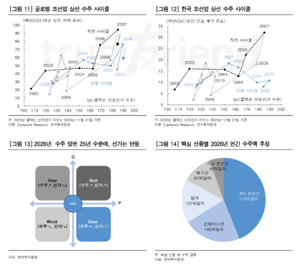 2026년은 선가 회복의 해라는 전망이다. 4일 한국투자증권 강경태 애널리스트에 따르면 내년 글로벌 조선업 사이클은 2025년을 딛고 반등할 것이라고 내다봤다. 수주량 성장없이 선가만 반등하는 것인데, 2026년 연간 글로벌 상선 신조계약 금액은 1020억달러(-21.5%, YoY)로 추정된다. 신조 계약금액은 LNG운반선을 포함한 5대 선종 합산 신조 720억달러에 기타 선종 발주액으로 300억달러를 더해서 구했다는 것이다.