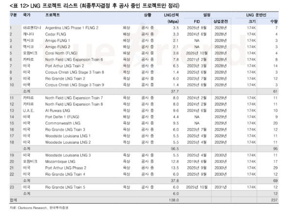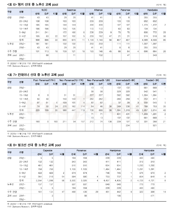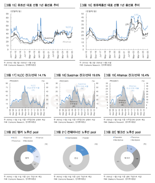 LNG운반선은 액화 터미널 매칭 수량 125척(1척당 255백만달러), 나머지 선종은 노후선 교체 풀(pool)을 3개년으로 나눠서 추정한 것이다. LNG운반선 신조 수요가 2022년 이후 최대치인데 반해 조선사들의 가용 슬롯은 부족하지만 2026년 핵심 선종인 LNG운반선 신조 계약 선가를 높여가면서 클락슨 신조선가지수(외화) 반등을 이끌어낼 것이라 전망하고 있다.