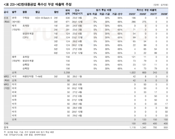 둘째, 수주 연도별 매출 mix를 구했다. 2026년 상선 매출은 대부분 2023~2024년에 수주한 호선들로 창출될 것이다. 조선사별 차이는 명확한데, HD현대중공업과 한화옹션을 비교하면 쉽다. HD현대중공업은 2026년 상선 매출액을 2023년 빈티지로 53%, 2024년 빈티지로 27% 만들어내는 한편 한화오션은 2023년 빈티지로 17%, 2024년 빈티지로 46%를 만든다. 이러한 차이의 원인은 한화오션의 2023년 수주 성과가 부족했기 때문이다. 한화오션의 2026년에 수주한 고선가 LNG운반선이 탱커로 훼손될 뻔한 전체 마진을 방어하는 해라고 강 애널리스트는 지적했다.