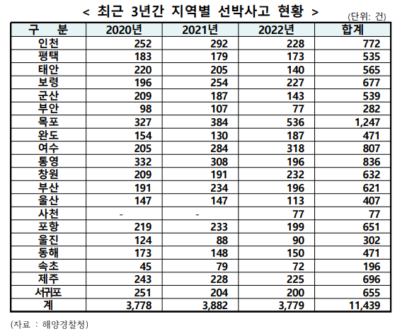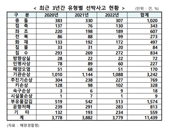 -매일 10건 이상 발생하는 선박안전사고! 지난 3년간 선박사고 총 11,439건 발생