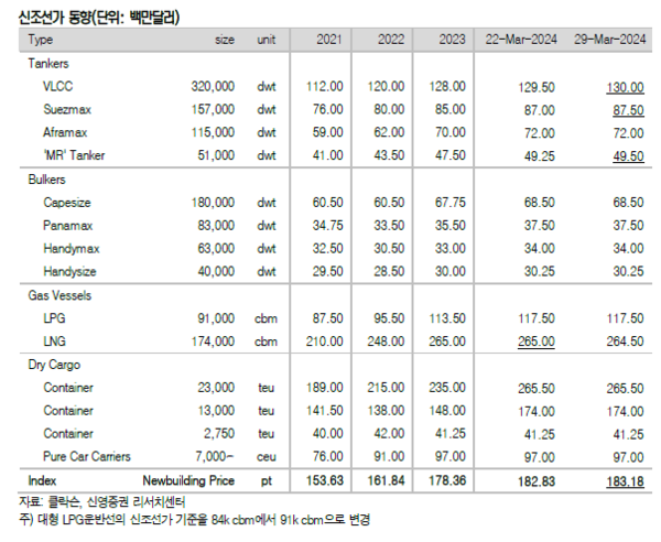 선종별 상세선가는 탱커 중 VLCC(초대형 유조선)와 수에즈막스급이 각각 50만달러 상승했고 MR탱커도 25만달러 올랐다. 가스선 중 174k(17만4000) cbm급 LNG선 신조선가는 50만달러 하락했다.