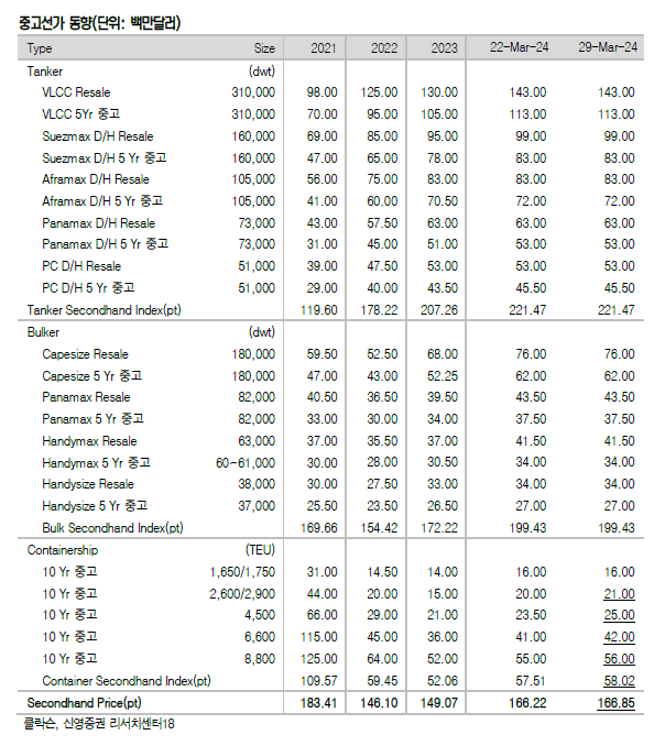 지난 주 드라이벌크선 해상 운임은 약세를 시현했다. 신조선가지수와 중고선가지수 모두 상승했다. 신영증권 엄경아 애널리스트에 따르면 2024년 13주차(3월 29일) 신조선가지수는 전주대비 0.35포인트 상승한 183.18p를 기록했다.