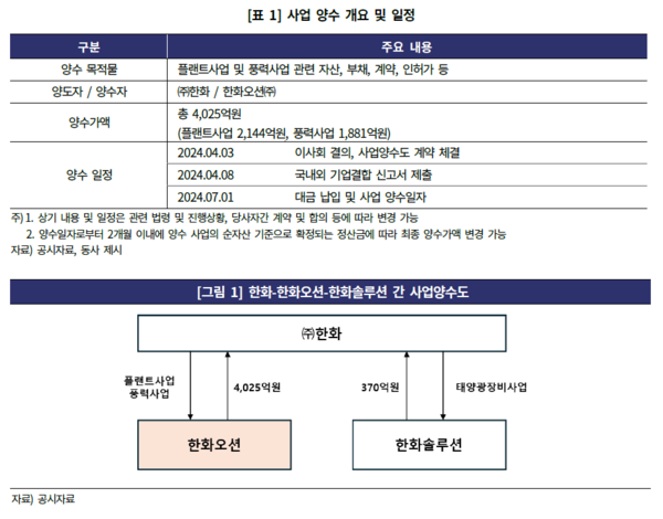 한화오션(BBB/Stable; 이하 '동사')이 그룹 내 플랜트·풍력사업 양수 계획을 발표했다. 양수 대상은 ㈜한화가 영위하고 있는 플랜트사업과 풍력사업에 관련된 일체의 자산 및 부채, 계약·인허가 등이고, 양수 금액은 총 4,025억원(예정)이다. 2024년 4월 3일 양사는 이사회 승인과 함께 사업양수도 계약을 체결하였고, 7월 1일을 사업 양수일자로 대금 납입이 완료될 예정이다.