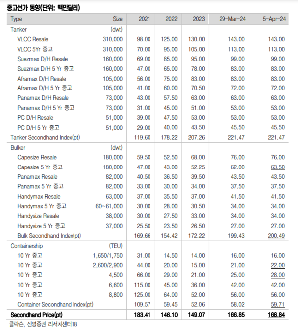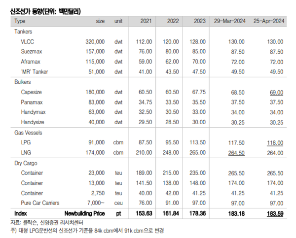 지난 주(4월 5일)는 신조 발주시장 양적 성장세를 시현했다. 신조선가와 중고선가지수 모두 상승했다. 신영증권 엄경아 애널리스트에 따르면 2024년 14주차(4월 5일) 신조선가 지수는 전주대비 0.41포인트 상승한 183.59을 기록했다. -
