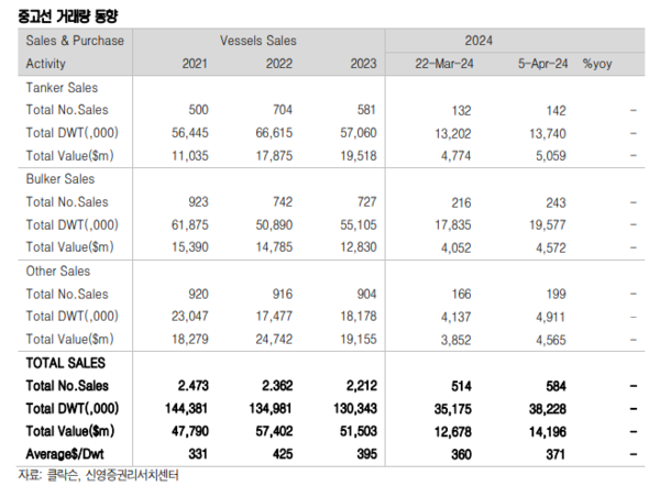 수주량은 2주간 오일탱커 23척, 케미칼 및 특수선 4척, LPG선 4척, LNG선 12척, 드라이벌 크선 19척, 컨테이너선 1척, 재너럴카고 7척, 로로선 3척, 해양지원선 3척, 여객선 및 크루즈 1척, 기타선박 2척 등 총 79척을 기록했다. 14주차 누적수주량은 401척이며, 2023년 동일기간 누적수주량은 300척 수준으로 발주 척수기준으로는 갭을 크게 벌리기 시작했다.