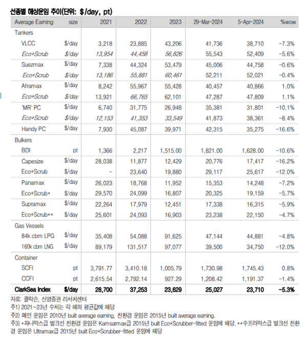 대형선 운임이 16.2% 하락한 17,417달러, 파나막스급은 7.2% 하락한 14,248달러, 수프라막스급이 5.9% 하락한 16,315달러를 기록했다. 가스선 운임은 VLGC운임이 4.8% 하락한 44,881달러를 기록한 것으로 나타났다. 대형 LNG 운반선(160k급)은 전주대비 12.0% 하락한 34,750달러를 기록했다. -