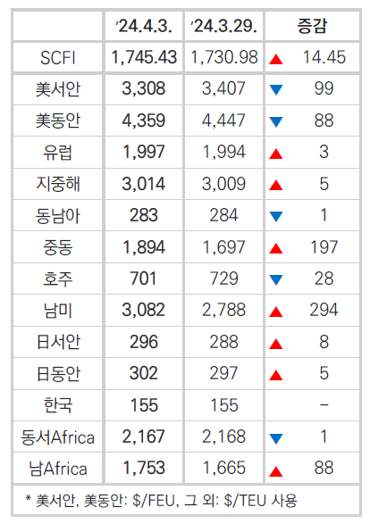 작년 홍해사태 이후 전고점인 2,239.61(1/19) 대비 약 22% 하락한 SCFI는4월 첫째주 소폭 상승하는 모습을 보이며 급락하던 운임이 2개월여만에 반등하며 안정세다.