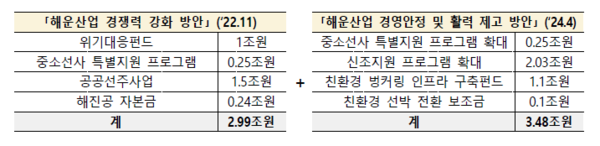 이에 정부는 선사별 맞춤형 위기대응 체계를 구축하여 국적선사의 경영악화를 사전에 방지하고, 친환경 규제와 환경‧사회‧투명경영(ESG) 경영 확산에 선제적으로 대응할 수 있도록 민간 자본의 친환경 선박 투자를 활성화하여 수출입 물류 등 우리나라의 해상공급망을 강화하고자 이번 방안을 마련하였다. 이번 방안은 「해운산업 경쟁력 강화방안(‘22.11)」에 따른 약 3조 원 규모의 경영안전판에 더하여, 국적선사의 체질을 개선하고 글로벌 규범을 선도하기 위해 약 3.5조 원을 추가 투자하는 계획이다.