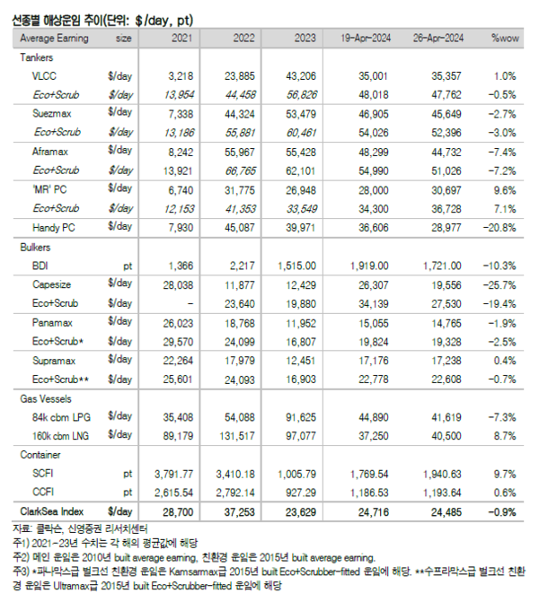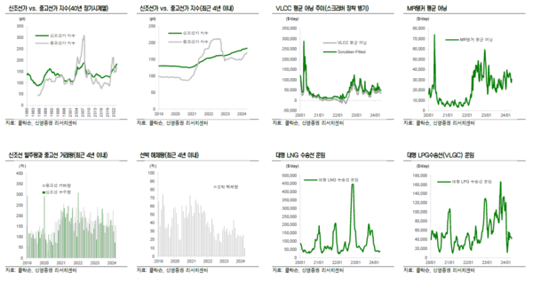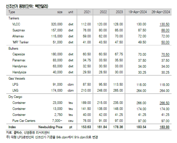 지난 주는 신조선 가격 협상력이 조선소로 넘어옴을 확신하는 한주였다. 신조선가와 중고선가지수 모두 상승했다. 신영증권 엄경아 애널리스트에 따르면 올해 17주차(4월 26일) 신조선가지수는 0.39포인트 상승한 183.93p를 기록했다. 선종별 상세선가는 탱커 중 VLCC(초대형 유조선), 수에즈막스, MR탱커 모두 50만달러씩 올랐다. 드라이벌커 중 케이프사이즈급도 50만달러 상승했다. 가스선은 변동이 없었다. 컨테이너선 중 2만3,000TEU급 신조선가 역시 50만달러 상승한 것으로 나타났다.