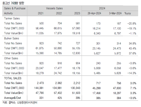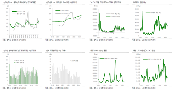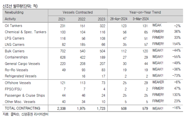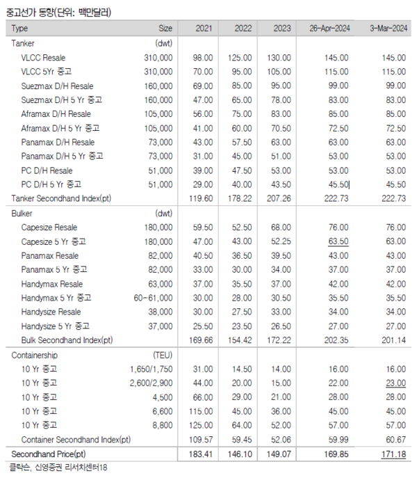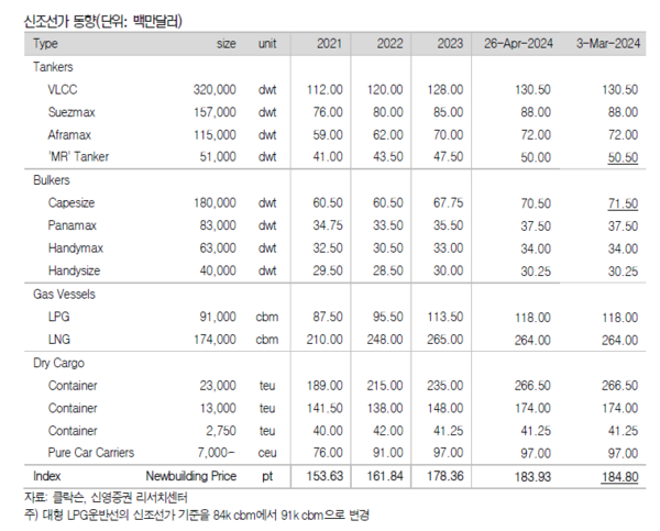 지난 주는 아시아 휴일 앞두고 발주량이 증가했고 선가도 상승했다. 신조선가와 중고선가지수 모두 상승한 것으로 나타났다. 신영증권 엄경아 애널리스트에 따르면 2024년 18주차(5월 3일) 신조선가지수는 전주대비 0.87포인트 상승한 184.80p를 기록했다. 선종별 상세선가를 보면 탱커 중 MR탱커는 50만달러 올랐다. 드라이벌크선 중 케이프사이즈급은 1백만달러 상승했고 가스선과 컨테이너선은 변동이 없었다. 수주량은 오일탱커 8척, 케미칼 및 특수선 9척, LPG선 4척, LNG선 22척, 드라이벌크선 8척, 컨테이너선 2척, 제너럴카고선 14척, 해양지원선 4척 등 총 71척을 기록했다. 18주차 누적수주량은 579척이며, 전년동기 누적수주량은 379척이었다. 18주차 중고선가지수는 전주대비 1.33포인트 상승한 171.18p를 기록했다.