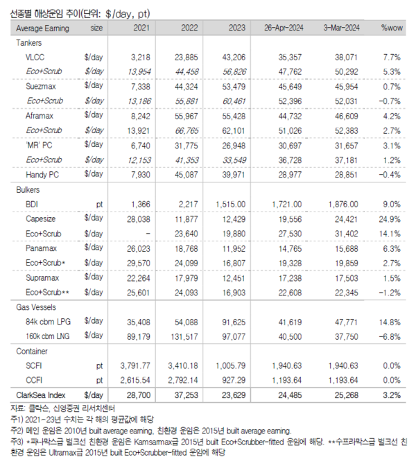 건화물선운임지수 BDI는 전주대비 9.0% 상승한 1876포인트를 기록했다. 대형선 운임이 24.9% 상승한 2만4421달러, 파나막스급은 6.3% 오른 1만5688달러, 수프라막스급은 2.7% 오른 1만9859달러를 기록한 것으로 집계됐다. 가스선 운임은 VLGC 운임은 14.8% 오른 4만7771달러를 기록했다. 대형 LNG운반선(160k급)은 전주대비 6.8% 하락한 3만7750달러를 기록했다.
