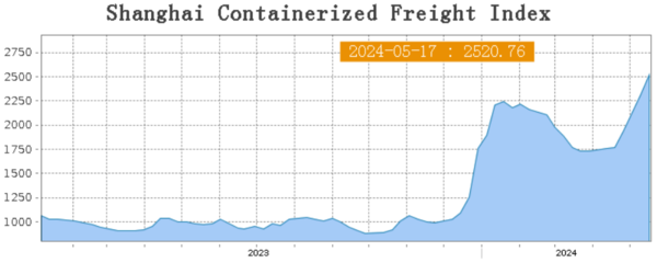 컨테이너운임지수 SCFI(상하이발컨운임지수)와 CCFI(중국발컨운임지수)의 급등세가 이어지고 있어 주목된다. 상하이항운교역소에 따르면 17일 스팟 컨운임지표 SCFI는 2520.76p로 전주(5월 10일 2305.79) 대비 214.97p(9.3%) 상승했다. 중장기 계약운임지표 CCFI는 1311.85p로 전주(1237.84)보다 6%나 올랐다.