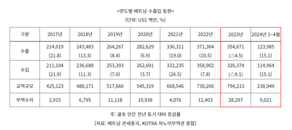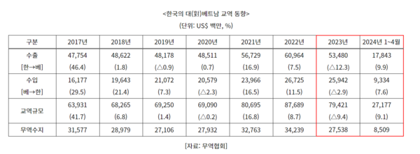 2024년 1~4월 기준 전년에 이어 한국은 베트남의 3위 교역대상국이다. 또한 한국은 베트남에 수출을 세 번째로 많이 하는 국가이며, 베트남의 수입 시장에서는 2위 자리를 지키고 있다. 양국 간 교역이 부진했던 2023년과 달리 올해는 대(對)베트남 수출 및 수입이 각각 9.9%, 7.6% 증가했다.