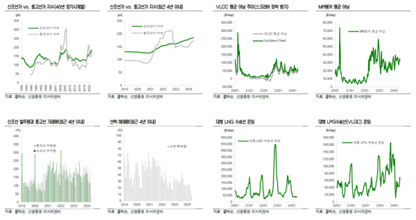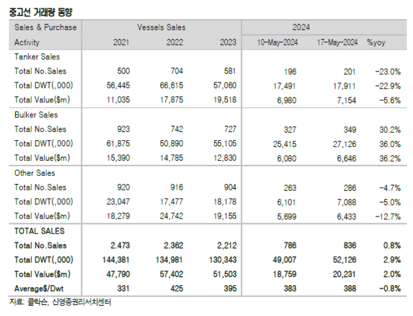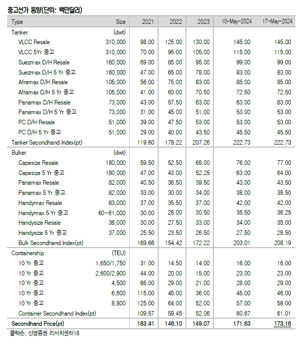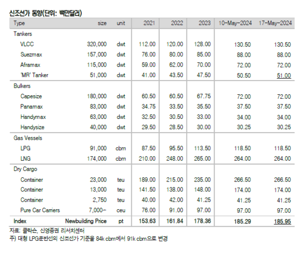 지난 주는 드라이벌크선을 제외하고 발주량이 강세였다. 신조선가지수와 중고선가지수 모두 상승했다. 신영증권 엄경아 애널리스트에 따르면 2024년 20주차(5월17일) 신조선가지수는 전주대비 0.66포인트 상승한 185.95p를기록했다. 선종별 상세선가는 탱커중 MR탱커가 50만달러 상승했고 드라이벌크선과 컨테이너선, 가스선은 변동이 없었다.
