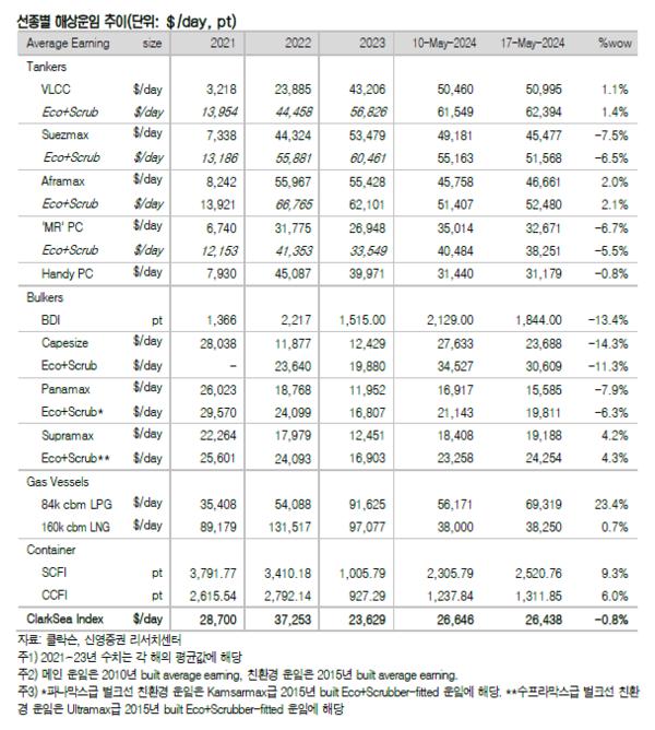 한편 지난주(5월 17일) 탱커 평균운임은 VLCC(초대형 유조선)가 1.1% 상승한 50,995달러, 수에즈막스는 7.5% 하락한 45,477달러, 아프라막스는 2.0% 상승한 46,661달러, MR은 6.7% 하락한 32,251달러를 기록했고 핸디사이즈는 0.8% 하락한 31,179달러를 기록한 것으로 나타났다.