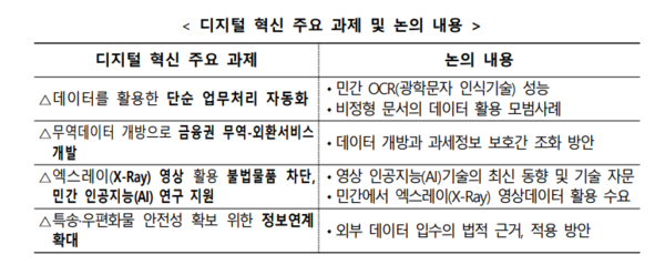 - △엑스레이(X-Ray) 영상 활용 불법물품 차단 및 민간 인공지능(AI) 연구 지원에 대해서는 민간의 데이터 활용 수요와 기술에 대해 자문하고,
