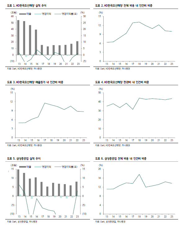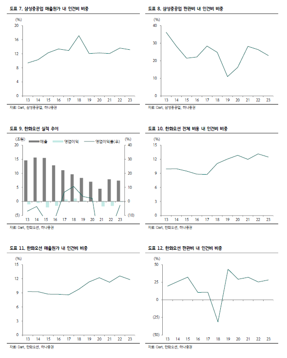 다만 하나증권은 매출원가 내 인건비에 주목한다. 이는 1) 수주잔고 및 경기에 따른 제조 인력의 수, 즉 매출원가 내 인건비 변동성이 상대적으로 크다는 점, 2) 국가 규제, 기업 경쟁력 확보 위해 연구개발 인력의 임금을 자유롭게 낮출 수 없다는 점, 3) 외국인 노동자 채용을 통해 제조 인력 총 임금은 효율화 시킬 수 있다는 점에 기인한다.