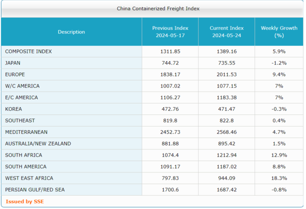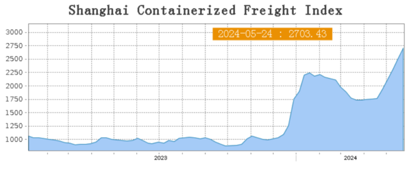 컨테이너운임지수 강세가 지속되고 있다. 상하이항운교역소에 따르면 5월 24일 스팟 컨운임 지표 SCFI(상하이발컨운임지수)는 2703.43p로 전주(5월 17일 2520.76) 대비 182,67p(7.2%) 올랐다. 중장기 계약운임지표 CCFI(중국발컨운임지수)는 1389.16p로 전주보다 5.9% 상승했다. 상승폭은 전주에 비해 다소 낮았다.