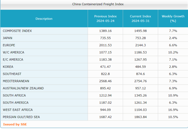 5월 31일 CCFI는 전주대비 7.7% 올라