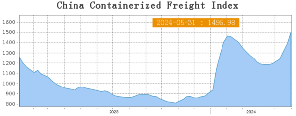CCFI는 1495.98p로 전주대비 7.7% 올랐다. CCFI 항로별 추이를 보면 동서아프리카항로가 전주대비 16.9%나 급등했고 중동항로도 10.5% 상승했다. 미서안은 10.2%, 미동안항로는 7.1% 올랐다. 유럽항로는 6.6% 상승했고 동남아항로는 6.3% 오른 것으로 나타났다.