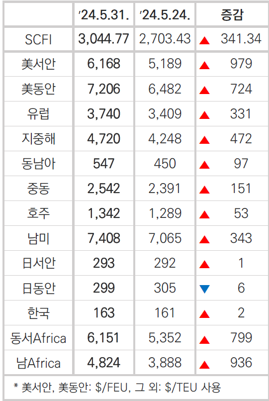 컨테이너 정기선 시황을 보면 이번주 SCFI종합지수는 341.34(12.6%) 상승한 3,044.77pt 기록했다.13개항로 중 12개항로 운임이 상승했고, 일본동안은 운임은 하락했다. 3,000선에 진입한 것은 2022년 8월 26일(3,154.26pt) 이후 21개월만이며, 이는 홍해사태 전고점(2,239.61pt, 1/19)대비 136% 수준이다.