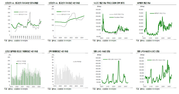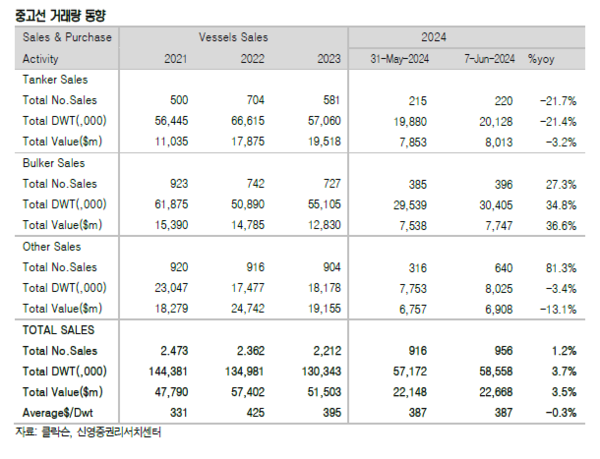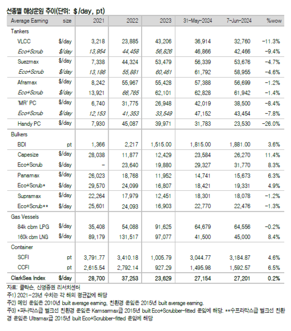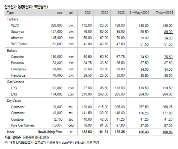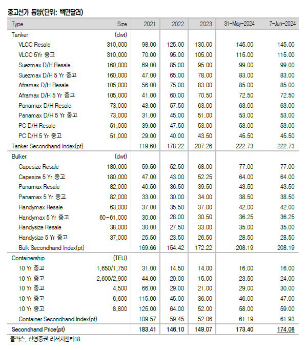지난 주는 컨테이너 정기선 운임과 중고선가가 모두 강세를 보였다. 신영증권 엄경아 애널리스트에 따르면 2024년 23주차(6월 7일) 신조선가지수는 전주대비 0.26포인트 상승한 186.69를 기록했다. 선종별 상세선가를 보면 탱커 중 수에즈막스는 50만달러, 아프라막스급은 1백만달러 각각 상승했다. 드라이벌크선 중 케이프사이즈급은 1백만달러 올랐다. 컨테이너선 중 23,000TEU급은 75만달러, 13,000TEU급은 75만달러 각각 상승한 것으로 집계됐다.