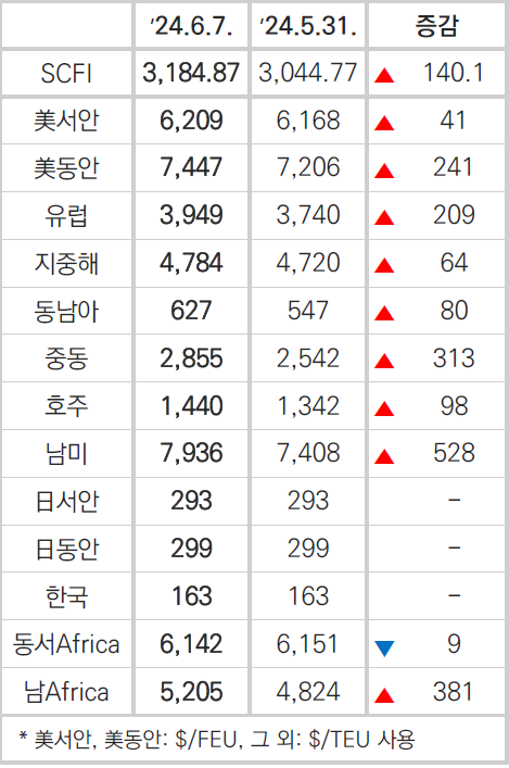 컨테이너 정기선 시황을 보면 지난주 SCFI종합지수는 전주대비 140.1pt 상승한 ‘3,184.87pt’를 기록, 올해 3월말부터 10주연속 상승세를 이어가며 계속해서 전고점을 경신하는 중이다.