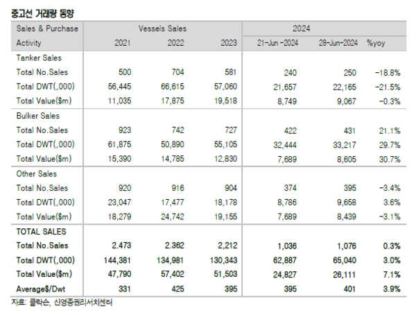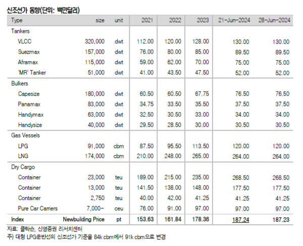 지난 주는 컨테이너운임과 벌크선 운임 모두 상승했다. 건화물선운임지수 BDI는 2000p를 회복했다. 신조선가지수는 하락하고 중고선가지수는 상승했다. 신영증권 엄경아 애널리스트에 따르면 2024년 26주차(6월 28일) 신조선가지수는 전주대비 0.01포인트 하락한 187.23p를 기록했다. 선종별 상세선가는 변동이 없었다.