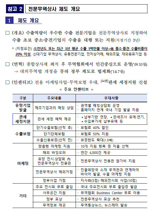 한편, 정부와 무역협회는 최근 글로벌 무역환경의 전문화 추세 속에서 전문무역상사들이 각자의 전문성을 살려 활동할 수 있도록 관련 지원을 유망업종 중심으로 고도화해나갈 계획이다. 우선, ➀기존 지역 중심 제조기업 발굴 체널에 더하여 업종별로 특화된 제조기업 발굴 채널을 구축하고, ➁기존의 종합 전시회 참가 등 일반 지원사업도 소비재(한류마케팅), 산업재(업종별 수출 로드쇼) 등 품목별로 세분화한다. 또한, ➂코트라가 보유한 유망품목 지원거점(거점무역관)을 전문무역상사 제도와 연계하여 주요 글로벌 기업과의 매칭 기회를 확대하는 등 다양한 지원방안을 검토할 예정이다.