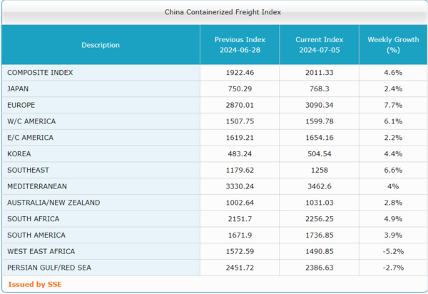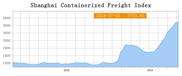 컨테이너운임지수 SCFI와 CCFI의 상승폭이 전주에 비해 줄었지만 여전히 운임 강세를 이어가고 있다. 상하이항운교역소에 따르면 7월 5일 스팟 컨운임 지표 SCFI(상하이발컨운임지수)는 3733.8p로 전주(3714.32)보다 19.48p(0.5%) 상승하는데 그쳤다.