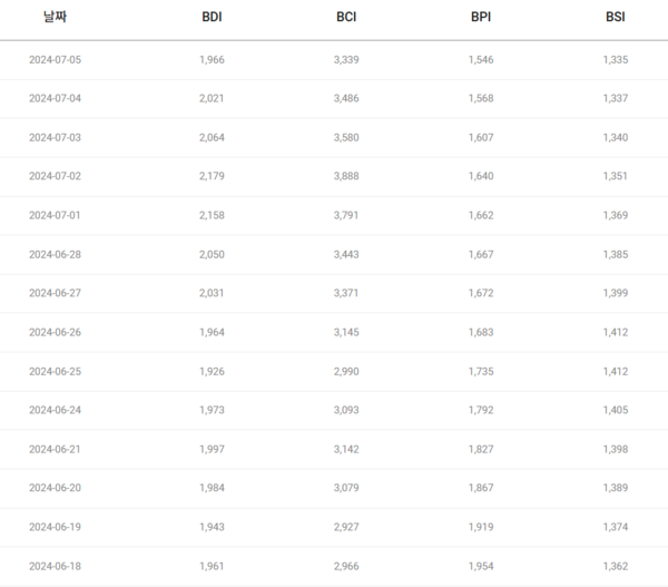 한편 건화물선운임지수 BDI도 2000p대를 회복했으나 7월 5일(금)에는 2천p가 무너지며 1966p를 기록했다.
