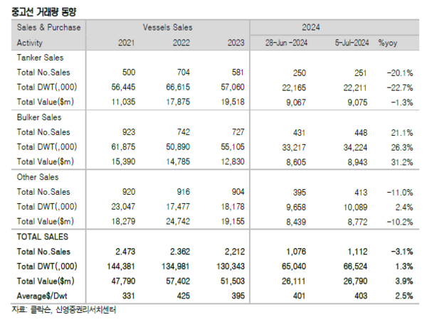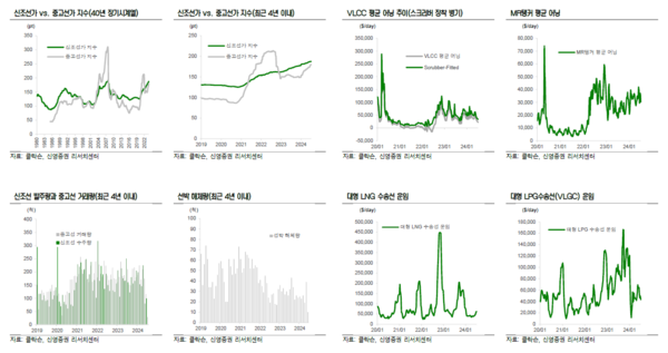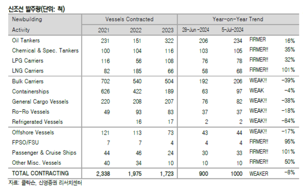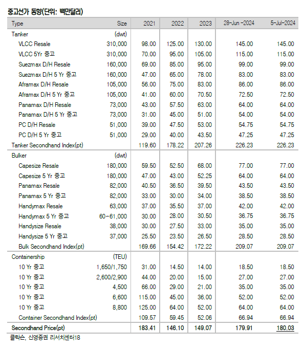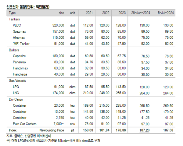 지난 주 해상운임은 주춤했고 발주량은 늘었다. 신조선가와 중고선가지수 모두 상승했다. 신영증권 엄경아 애널리스트에 따르면 2024년 27주차(7월 5일) 신조선가지수는 전주대비 0.3포인트 상승한 187.53p를 기록했다.