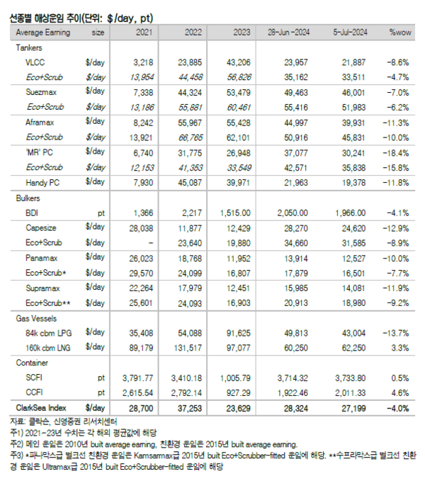 컨테이너 정기선 운임 상승세는 둔화했고 타선종 운임은 대부분 조정됐다. 지난주(7월 5일) 탱커 평균운임은 VLCC는 8.6% 하락한 21,887달러, 수에즈막스는 7.0% 하락한 46,001달러, 아프라막스는 11.3% 하락한 39,931달러, MR은 18.4% 하락한 30,241달러를 기록했고 핸디사이즈는 11.8% 내린 19,378달러를 기록한 것으로 집계됐다.