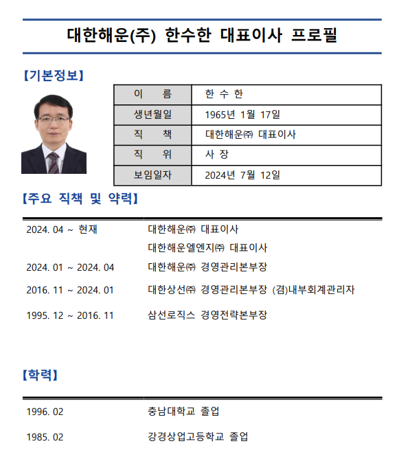 한수한 신임 대표이사는 1965년생으로 강경상업고등학교와 충남대학교를 졸업했다. 삼선로직스 경영전략본부장, 대한상선 경영관리본부장 겸 내부회계관리자, 대한해운 경영관리본부장 등을 역임했다.