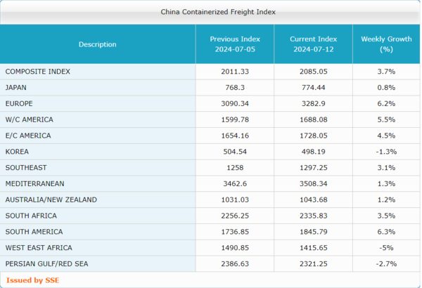 상하이항운교역소에 따르면 7월 12일 SCFI는 3674.86p로 전주(7월 5일) 3733.8p에 비해 58.94p(1.6%) 하락한 것으로 집계됐다. 중장기 계약운임 지표 CCFI(중국발컨운임지수)는 12일 2085.05p로 전주보다 3.7% 상승했다. 전주보다 상승폭은 줄었다.
