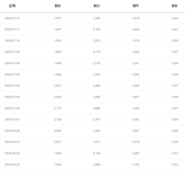 한편 건화물선운임지수 BDI도 최근 하락세가 이어지면서 2000p 아래에서 형성되고 있다.