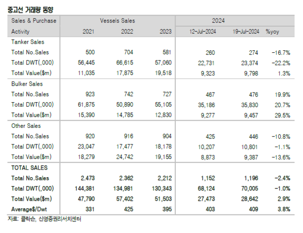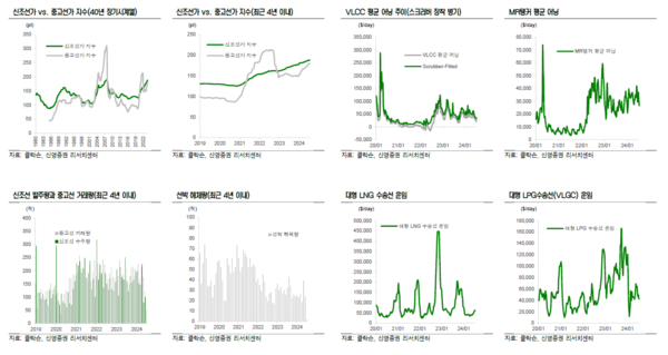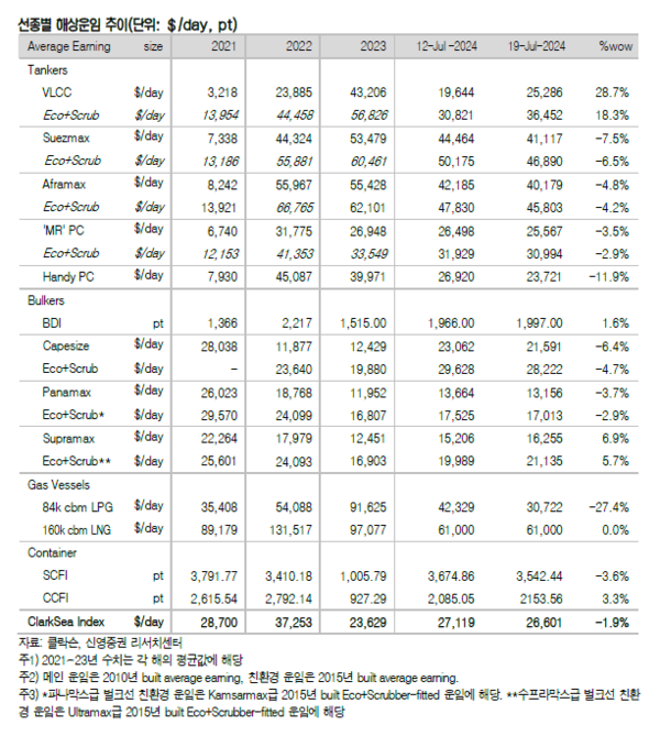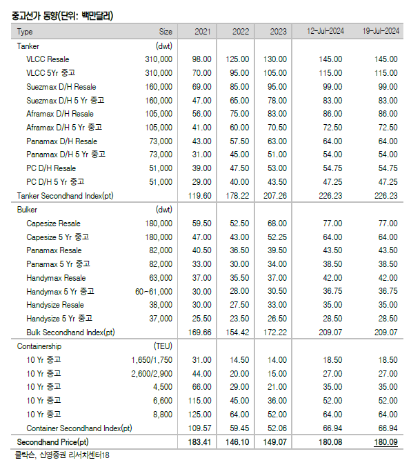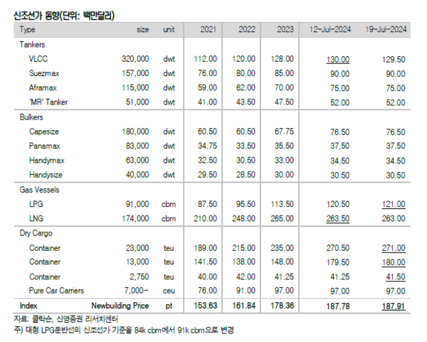지난 주 해상운임은 전반적으로 약세를 보였다. 신조선가와 중고선가지수 모두는 상승했다. 신영증권 엄경아 애널리스트에 따르면 2024년 29주차(7월 19일) 신조선가지수는 전주대비 0.13포인트 상승한 187.91p를 기록했다.