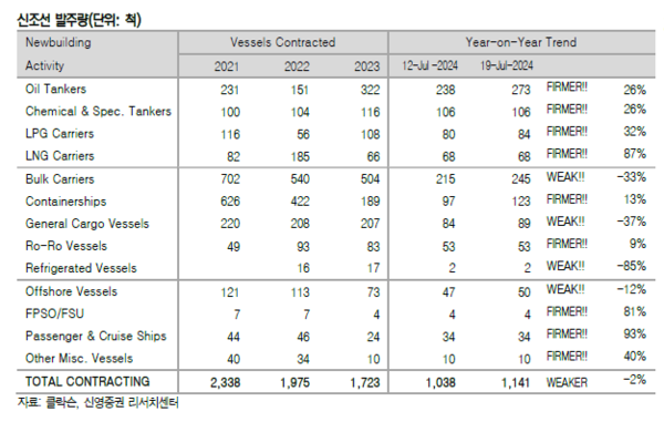 수주량은 오일탱커 35척, LPG선 4척, 드라이벌크선 30척, 컨테이너선 26척, 제너럴카고선 5척, 해양지원선 3척 등 총 103척을 기록했다. 29주차 누적수주량은 1,141척이며, 전년동기 누적수주량은 789척이었다.