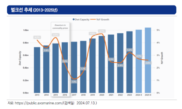 한국해양수산개발원(KMI) 권보배 전문연구원은 ‘KMI 국제물류위클리’을 통해 벌크선 현황 및 2025년 전망을 밝혔다. 이에 따르면 2013~2023년까지 경제 성장과 무역 패턴의 변화, 기술 발전, 원자재 수요 증가 등으로 글로벌 벌크선의 용량이 상당히 증가했다.