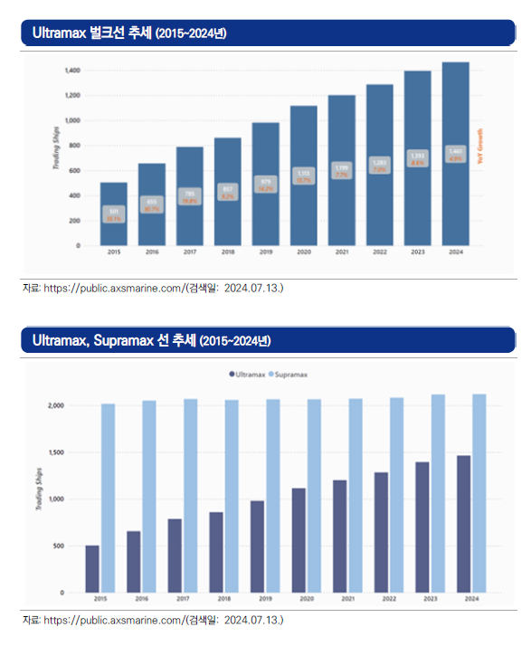 지난 10년 동안 소위 울트라막스(Ultramax) 벌크선 수주가 늘고 있다. 평균적으로 이러한 선박은 슈퍼막스(Supramax)보다 10m 더 길고 화물 용량은 12% 이상 더 커짐에 따라 항해 당 화물 운송량이 많아지므로 운송 효율성이 높아질 수 있으므로 화물 단위당 비용이 절감될 수 있다.