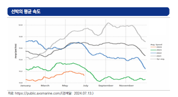 4년 연속으로 글로벌 벌크선 선대의 평균 속도가 꾸준히 감소하고 있으며, 지난 4년 중 2024년이 가장 낮은 수준이다.