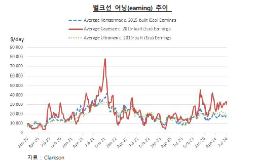 하지만 상반기 중 운임이 전년동기 대비 매우 높은 수준을 나타내어 Clarkson 어닝(이하 “어닝”)은 전년동기 대비 강세를 보였다.
