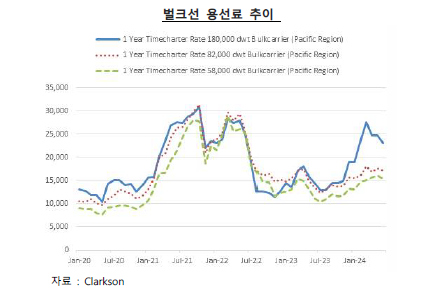 벌크선의 정기용선료는 1분기 중 빠르게 상승한 후 2분기에 다소 조정되며 하락하는 경향을 보였으나 분기 평균으로는 1분기 대비 높은 수준을 나타냈다.