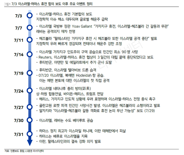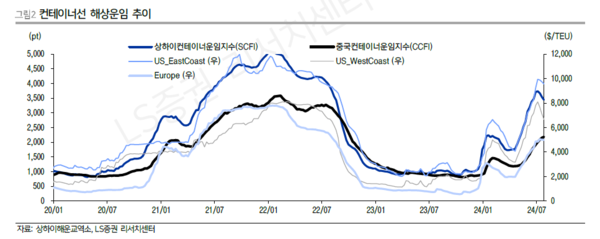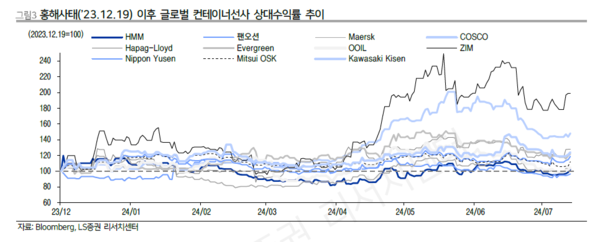 LS증권 이재혁 애널리스트는 홍해사태 업데이트를 통해 이스라엘의 베이루트 공급과 하니예 피살로 홍해의 지정학적 긴장이 확대됐다며 하반기 글로벌 컨테이너선사의 우회항로 채택 및 공급망 불안은 지속될 전망이라고 밝혔다.