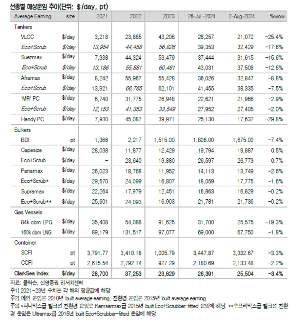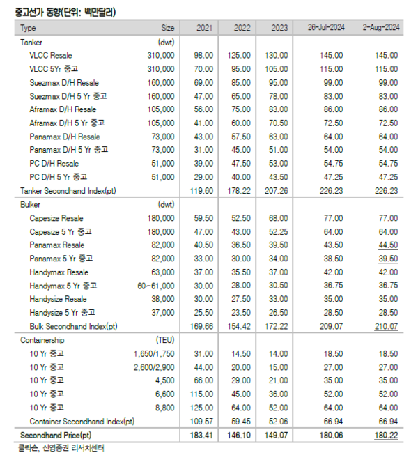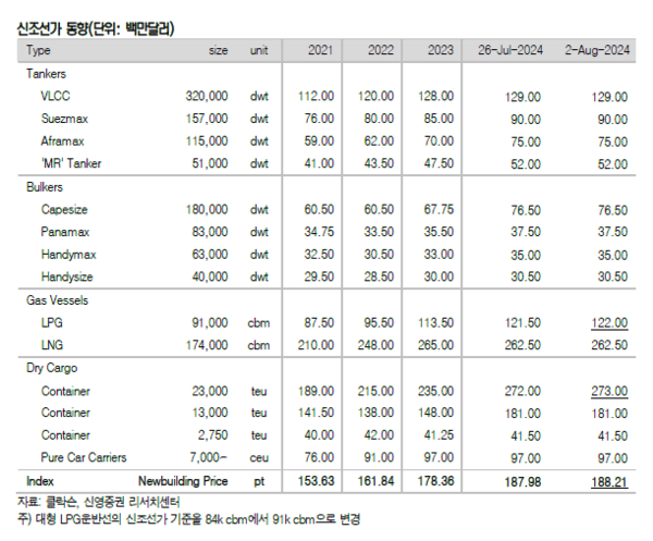 스팟 컨운임 SCFI와 함께 중장기 계약운임 CCFI가 동반 하락하면서 컨테이너운임시장이 초긴장하고 있다. 일각에선 숨고르기(?)로 표현하기도 하지만 예사롭지 않다. 아울러 전면전 전운이 감도는 악화일로에 있는 중동정세가 또다시 주목받고 있다. 지난 주 신조선가지수는 상승했고 중고선가지수는 하락했다. 신영증권 엄경아 애널리스트에 따르면 2024년 31주차(8월 2일) 신조선가지수는 전주대비 0.23포인트 상승한 188.21p를 기록했다. 선종별 상세선가는 탱커와 드라이벌커는 변동이 없었다. 가스선 중 91k(9만1000) cbm급은 50만달러 상승했다. 컨테이너선 중 23,000TEU급은 1백만달러 올랐다.