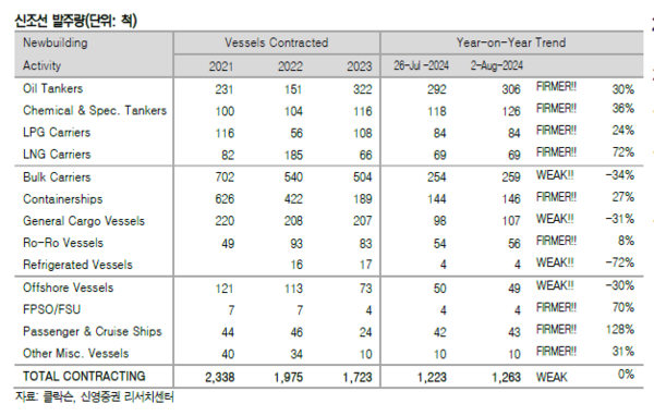 수주량은 오일탱커 14척, 케미칼 및 특수선 8척, 드라이벌크선 5척, 컨테이너선 2척, 제너럴카고선 9척, 로로선 2척, 여객선 및 크루즈 1척 등 총 41척을 기록했다. 해양지원선 1척은 취소됐다. 31주차 누적수주량은 1,263척이며, 전년동기 누적수주량은 880척이었다.