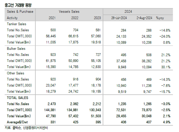 31주차 중고선거래량은 30척을 기록했다. 누적기준으로는 1,265척이 거래됐으며, 전년동기는 1,304척을 기록했다.